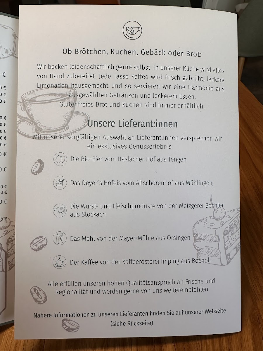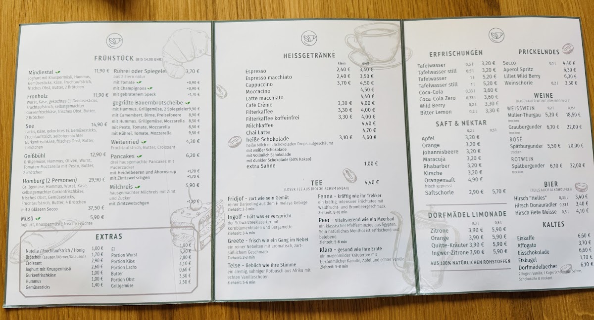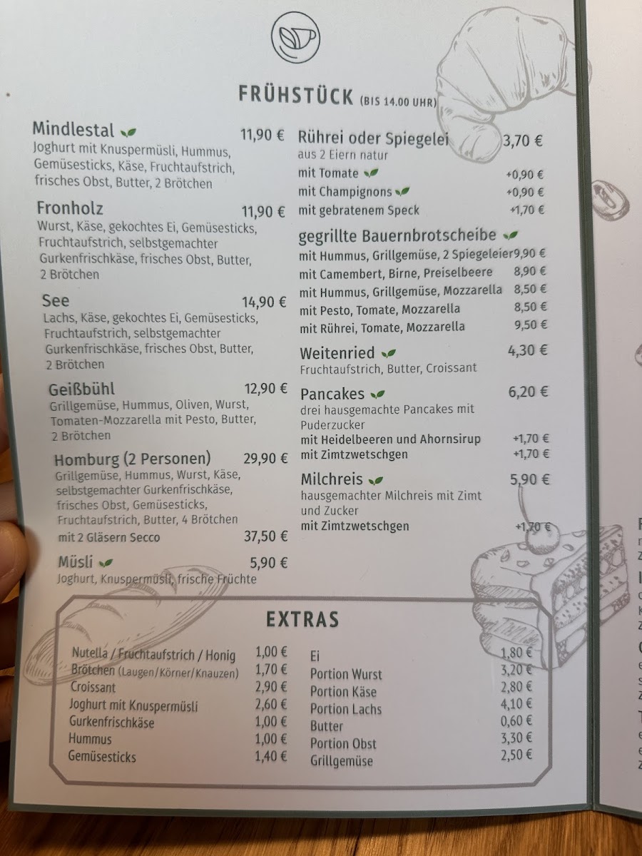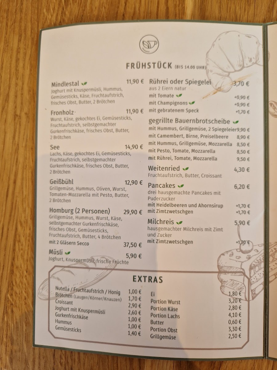 The menu offers a variety of options primarily focused on breakfast and light meals. Guests can find classic breakfast dishes including options such as pancakes served with powdered sugar or blueberries, croissants, muffins, and different egg preparations like scrambled eggs with bacon or separate fried eggs. There are also sandwiches featuring ingredients like tomato and mozzarella on Bauernbrot (farmhouse bread). Seasonal soups, such as pumpkin-ginger soup, are available as well.