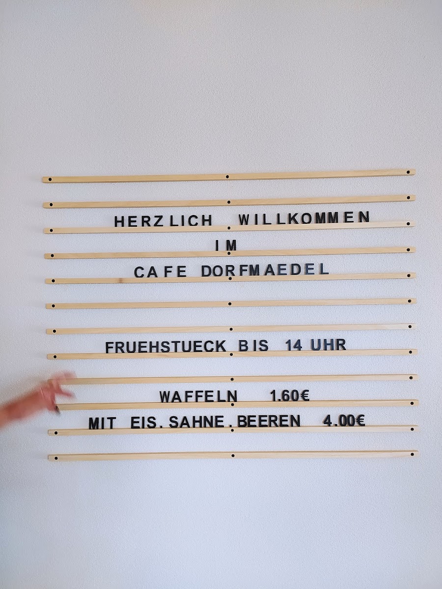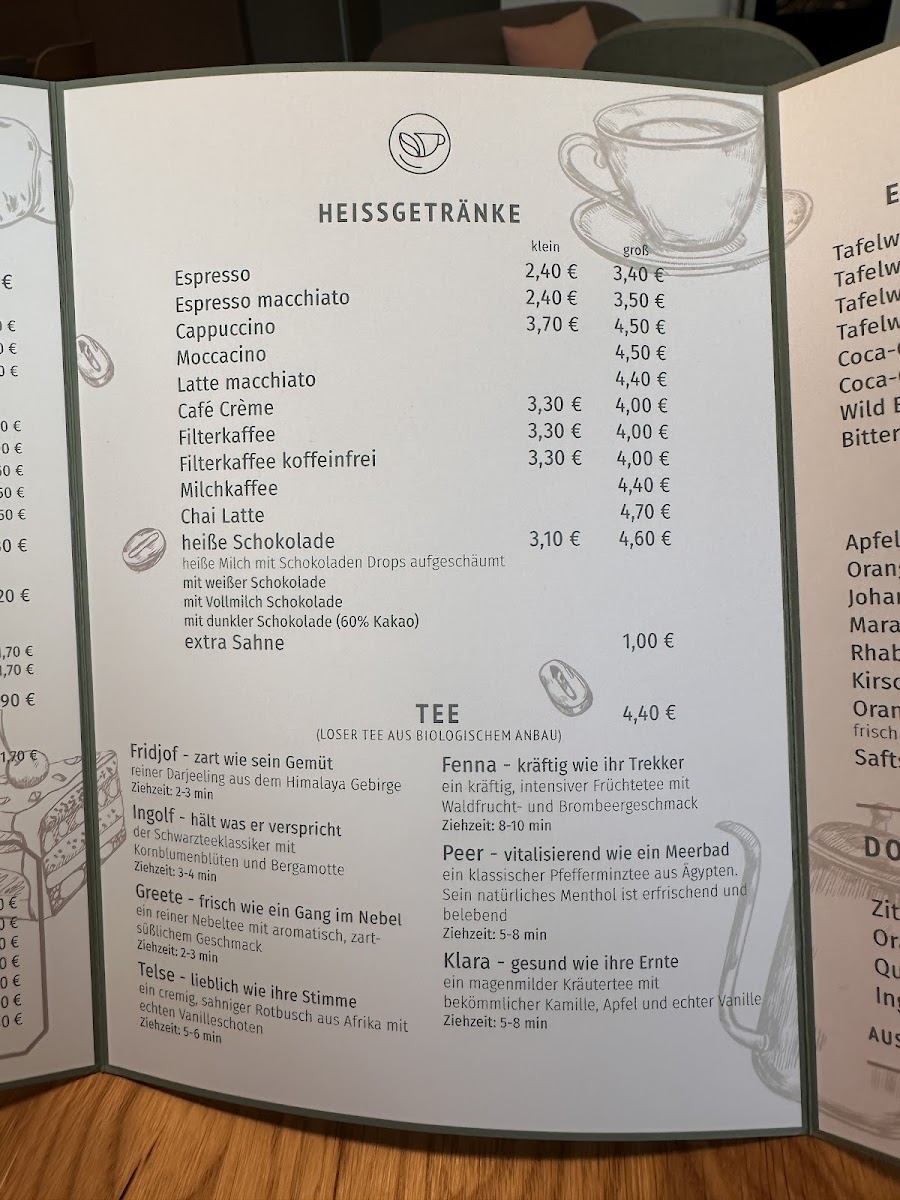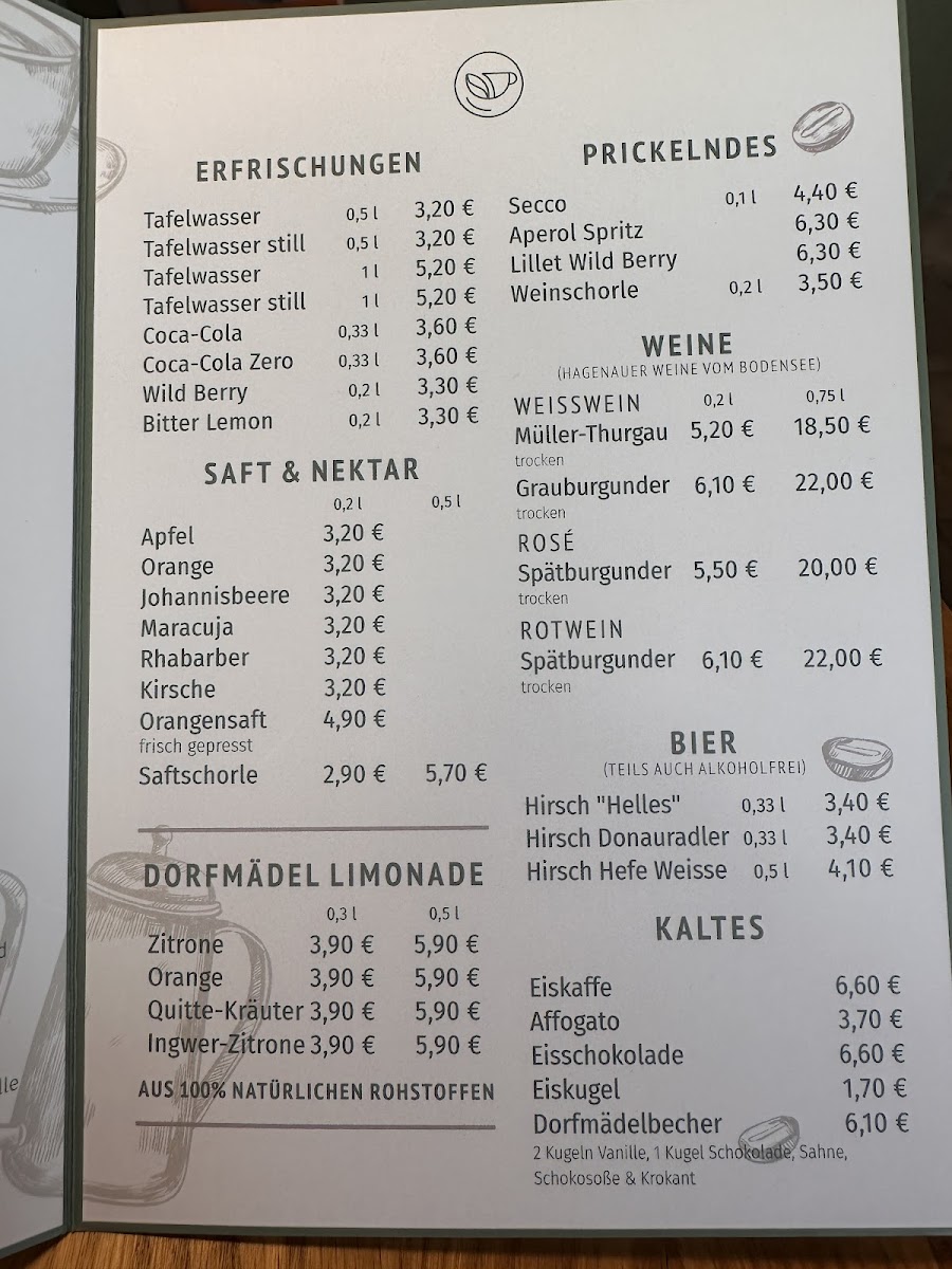 The menu offers a variety of options primarily focused on breakfast and light meals. Guests can find classic breakfast dishes including options such as pancakes served with powdered sugar or blueberries, croissants, muffins, and different egg preparations like scrambled eggs with bacon or separate fried eggs. There are also sandwiches featuring ingredients like tomato and mozzarella on Bauernbrot (farmhouse bread). Seasonal soups, such as pumpkin-ginger soup, are available as well.